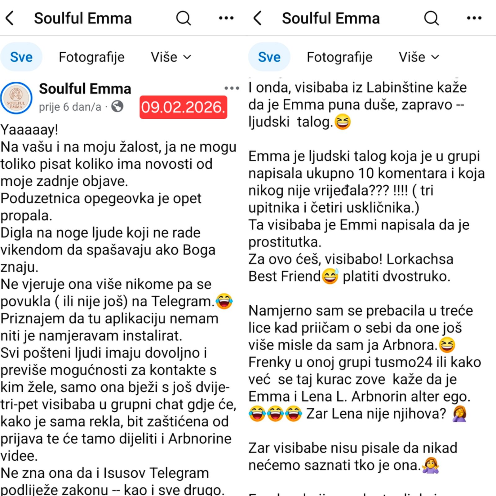 Kako rekoh, ne jednom, svačije lajanje po javnim mrežama snosi posljedice, pa bili vi A.E., N.E.,S.E. L.L., H.N., D.G., A.C., I.C., L.B.F. koja je iz žrtve izrasla u nasilnika kao i A.E.itd.
