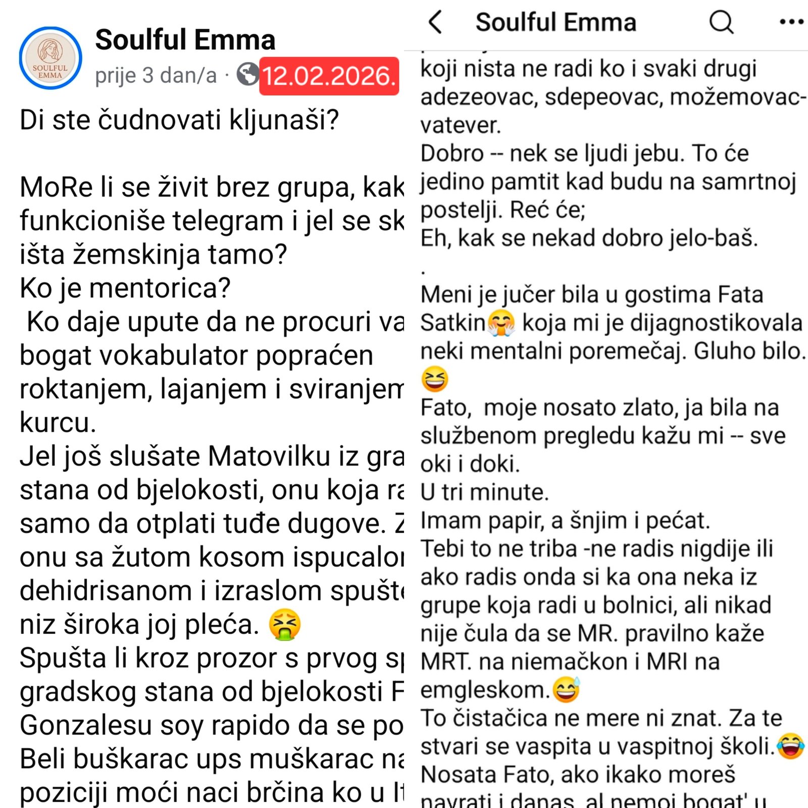 I usput, ja da hebem ono što ti i delulu kraljice mislite, i stavljate po fb, bacio bih ga keru ili otresao iza vrbe. Tvoje babe su ipak prestare za mene, suhe kraljice, važne samo online!