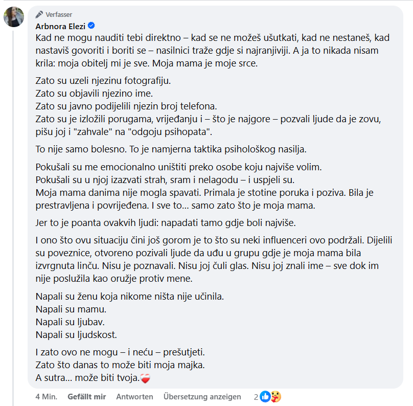 📵 Moja majka, koja ni na koji način nije javna osoba, niti se ikada ikome zamjerila, primala je stotine uznemirujućih poruka i poziva, danima. Bila je prestrašena i povrijeđena. Ova osoba ju je dovela u direktnu opasnost, samo zato što je moja majka.